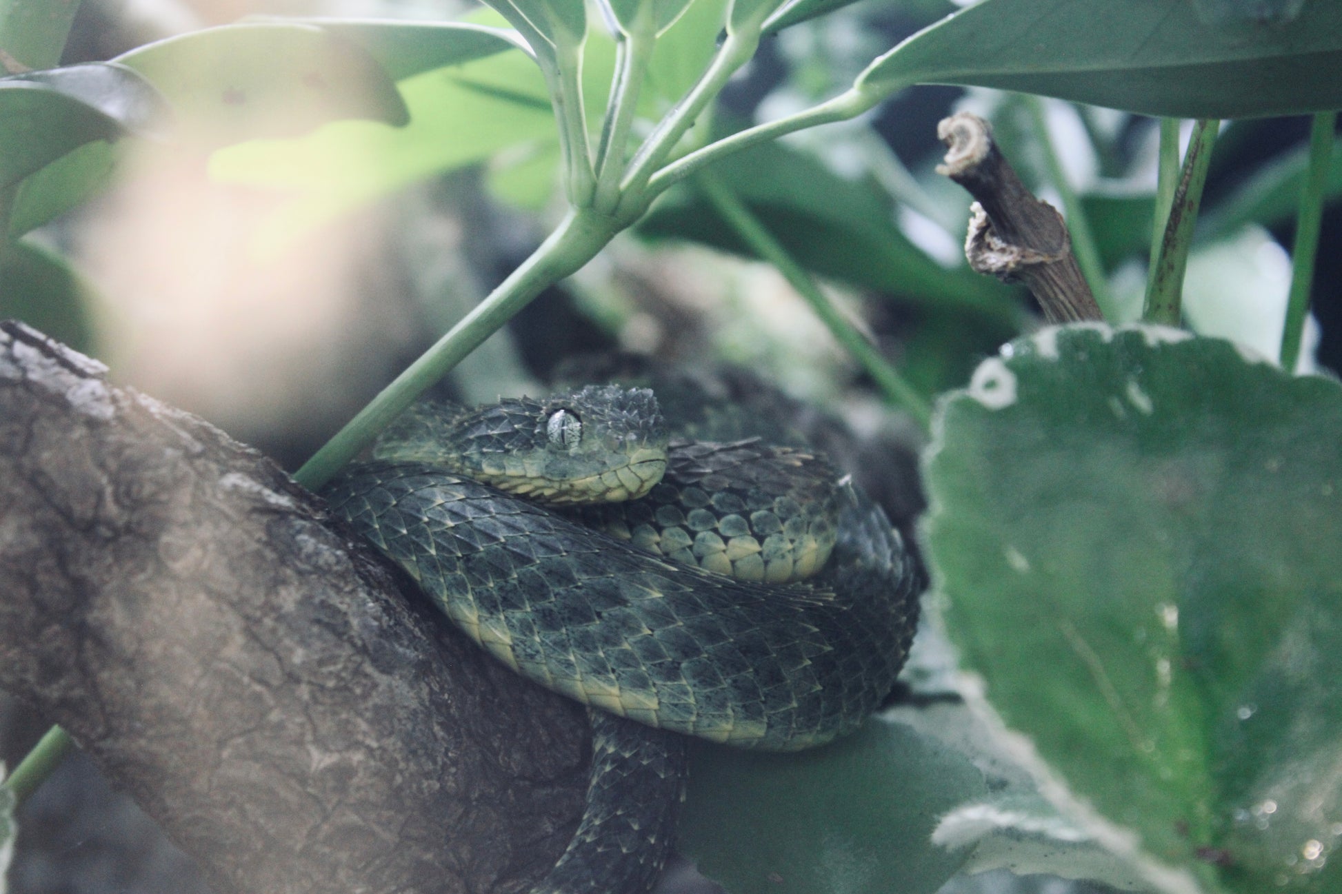 Witness the beauty and danger of the Bush Viper in the detailed shot. Coiled gracefully around a branch, its vibrant green and grey patterns create a mesmerizing display of camouflage. The surrounding leaves enhance its disguise, making it a stealthy predator in its lush habitat.