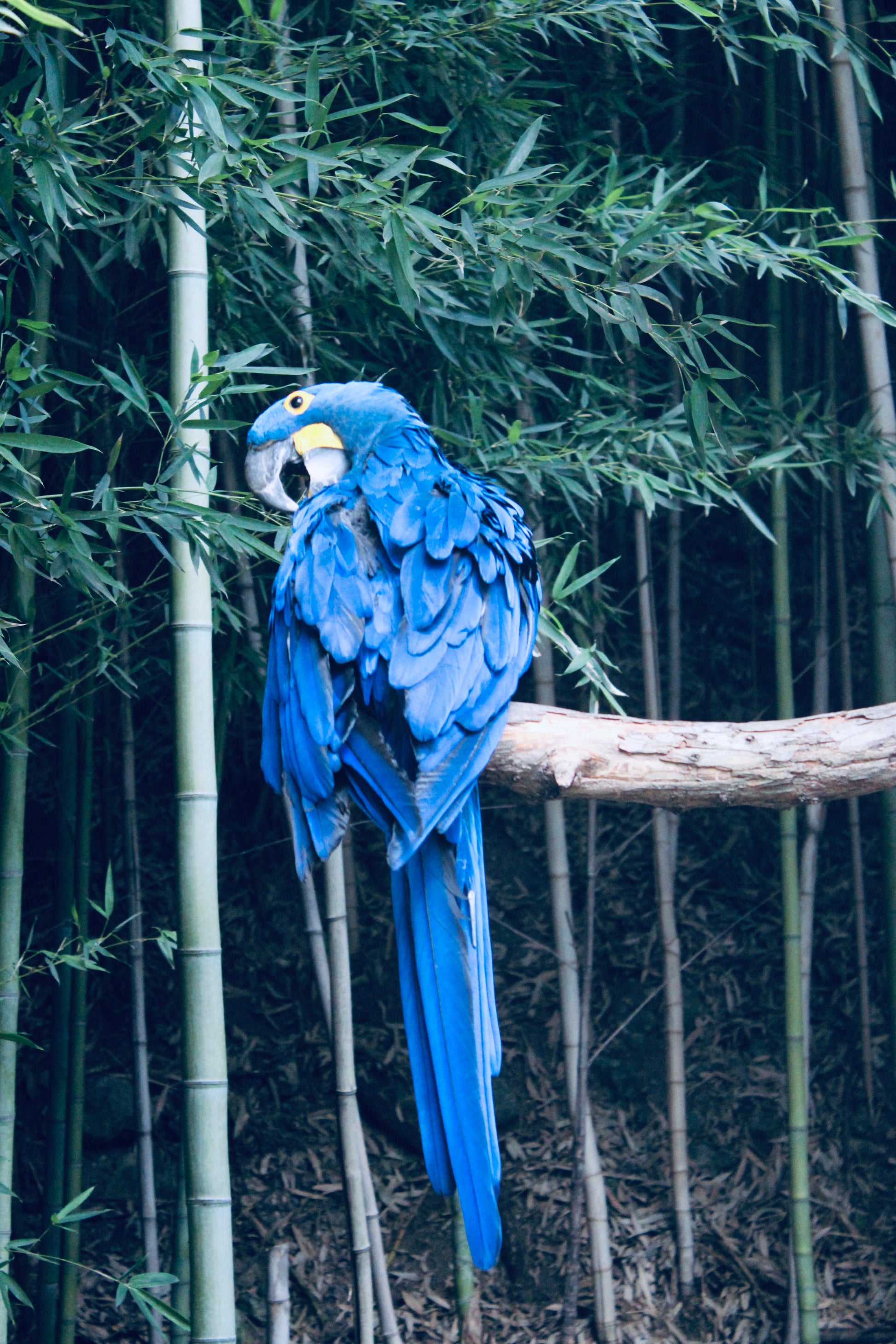 The image captures the regal beauty of a Hyacinth Macaw as it perches gracefully on a tree branch. With its back turned to the camera, the macaw displays its striking blue plumage, accentuated by vibrant yellow eye rings and a patch of yellow near its beak. The backdrop features lush bamboo trees, adding depth and a natural element to the composition. The focus is sharp, highlighting the intricate details of the bird's feathers and the surrounding foliage.