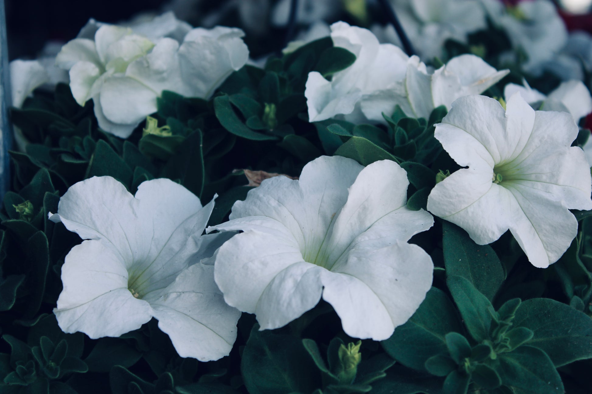 The image showcases a captive close-up of several white Petunia flowers, each displaying delicate, ruffed petals and a subtle yellow center. The surrounding lush green foliage provides a striking contrast, enchanting the purity and elegance of the blooms. The photograph captures the intricate details of the petals, highlighting their texture and form, creating a serene and inviting visual experience.